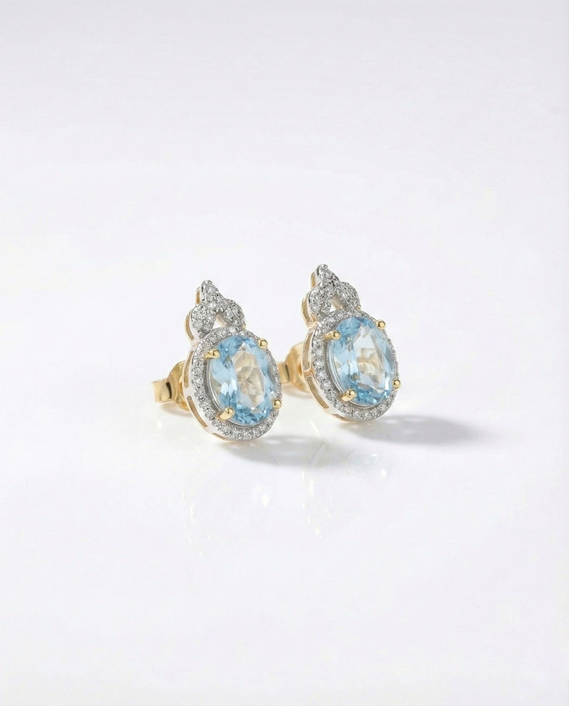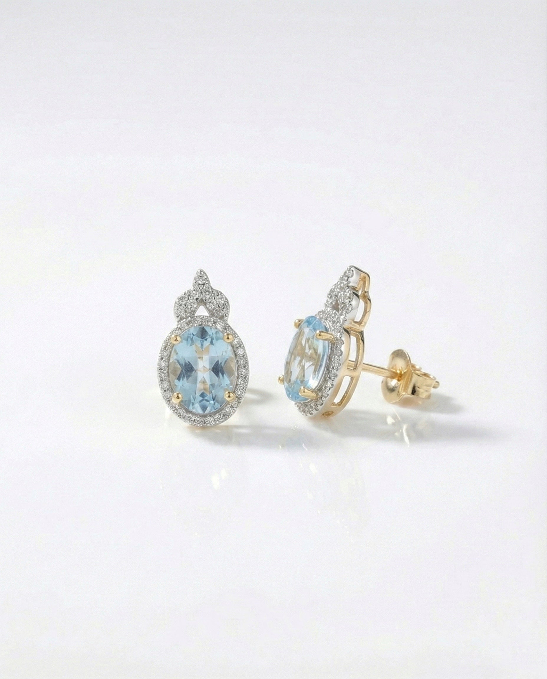 "Embrace elegance with these breathtaking oval stud earrings, featuring a serene aquamarine-blue center stone. Surrounded by a sparkling halo of clear crystals and topped with a delicate decorative accent, these earrings are crafted in premium 925 Sterling Silver. A perfect accessory to add a soft, luxurious touch to your day or evening look."