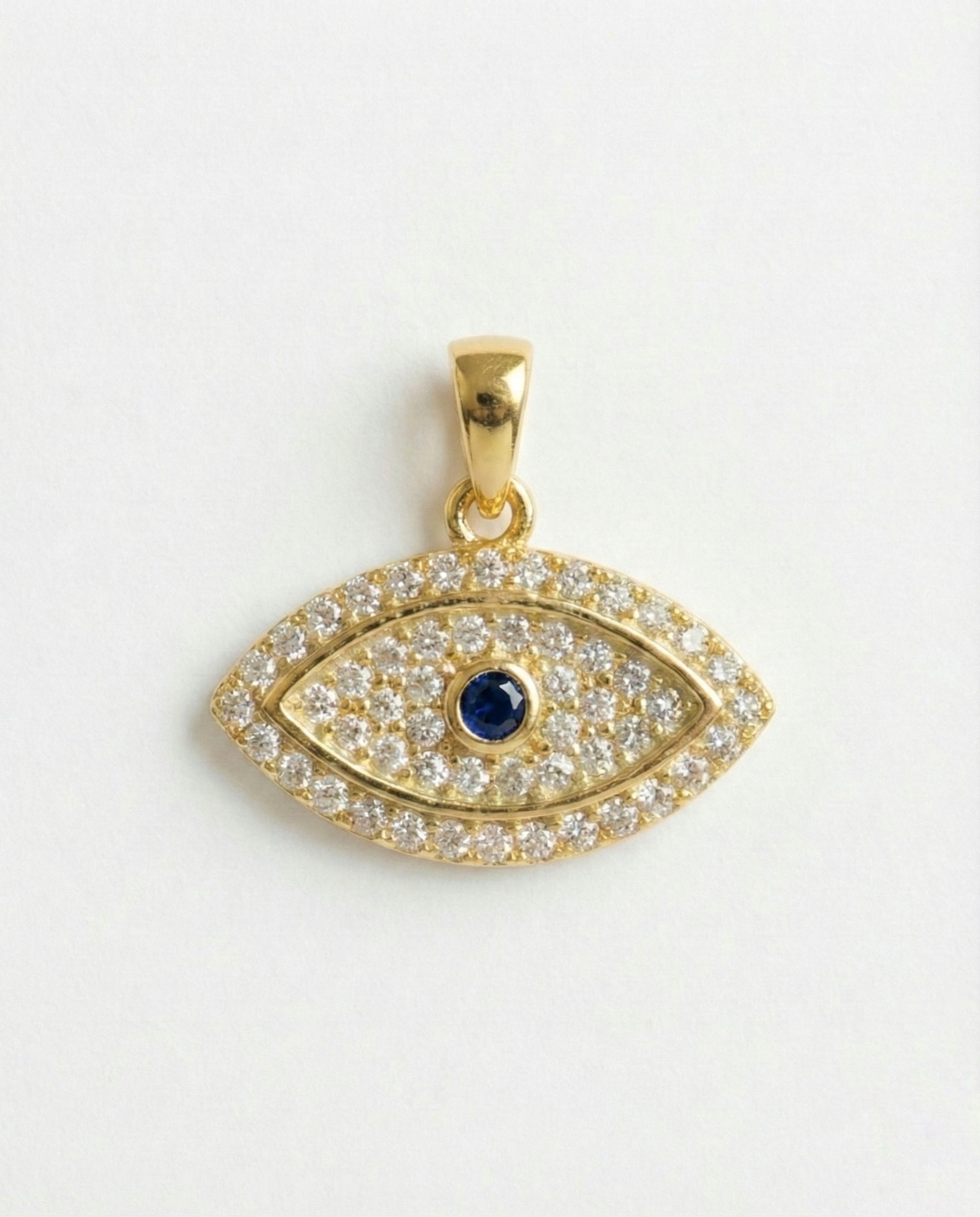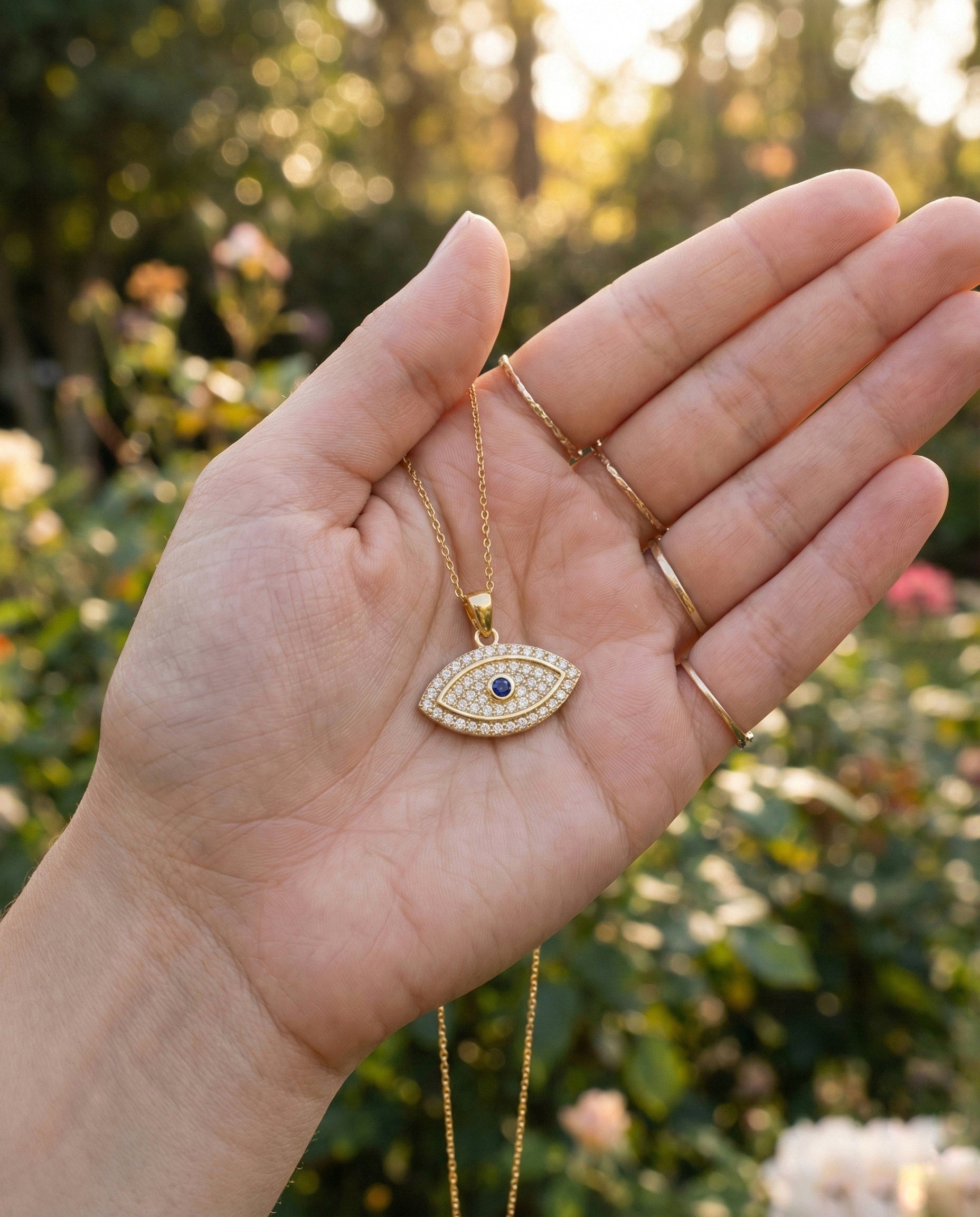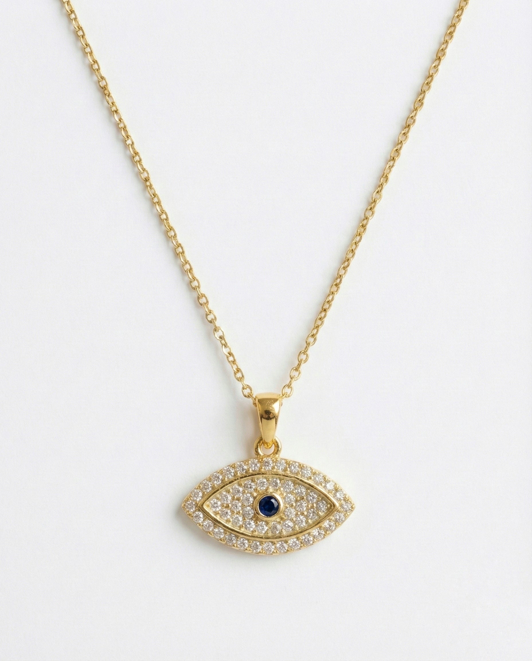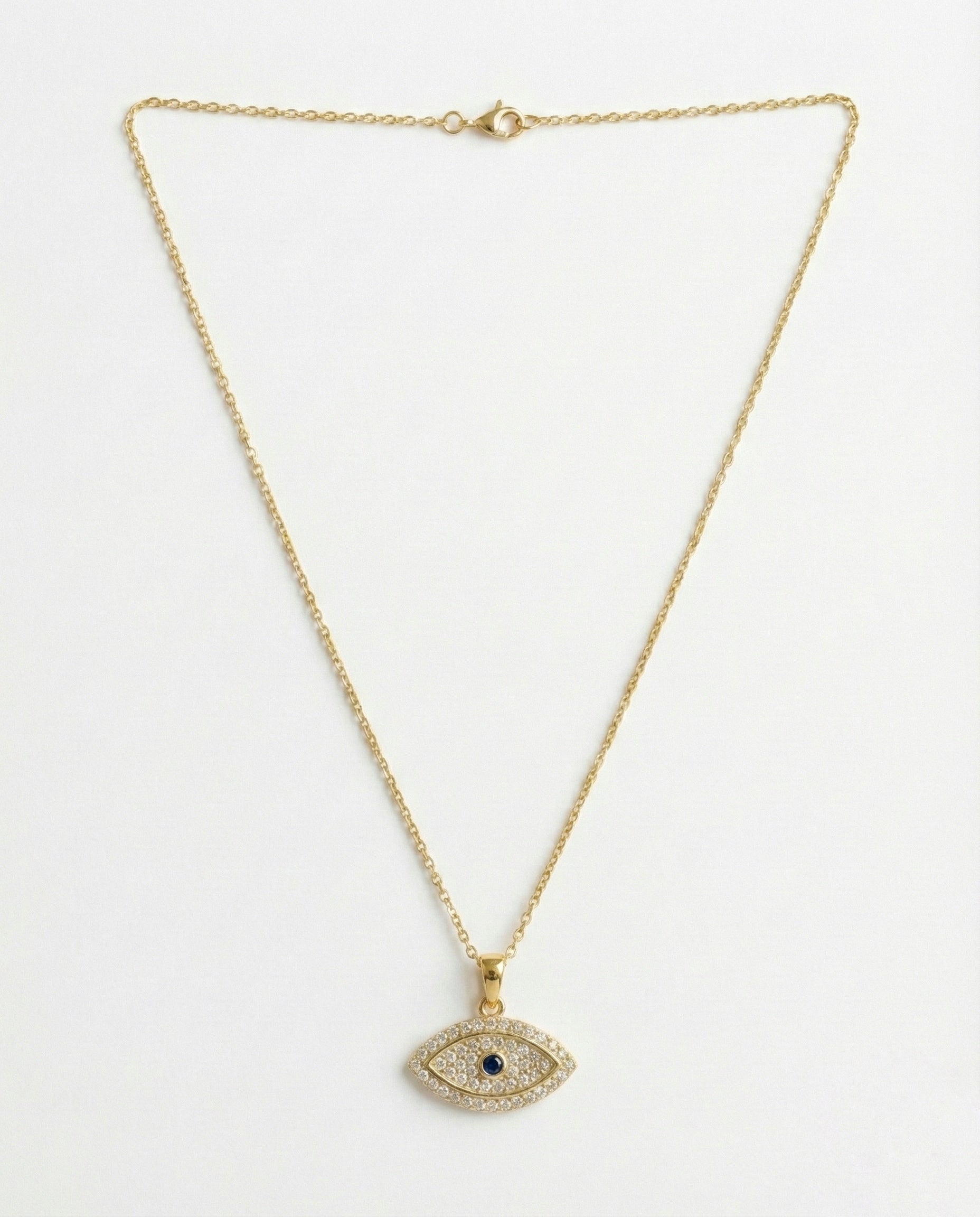 "Captivate everyone around you with this stunning 'Cat Eye' style necklace. The pendant features a striking marquise shape, fully encrusted with shimmering clear crystals that mimic the intense gaze of a cat. A deep Sapphire Blue stone sits at the center as the pupil, creating a bold contrast against the warm gold plating. This protective talisman is both a meaningful charm and a fashionable statement piece."