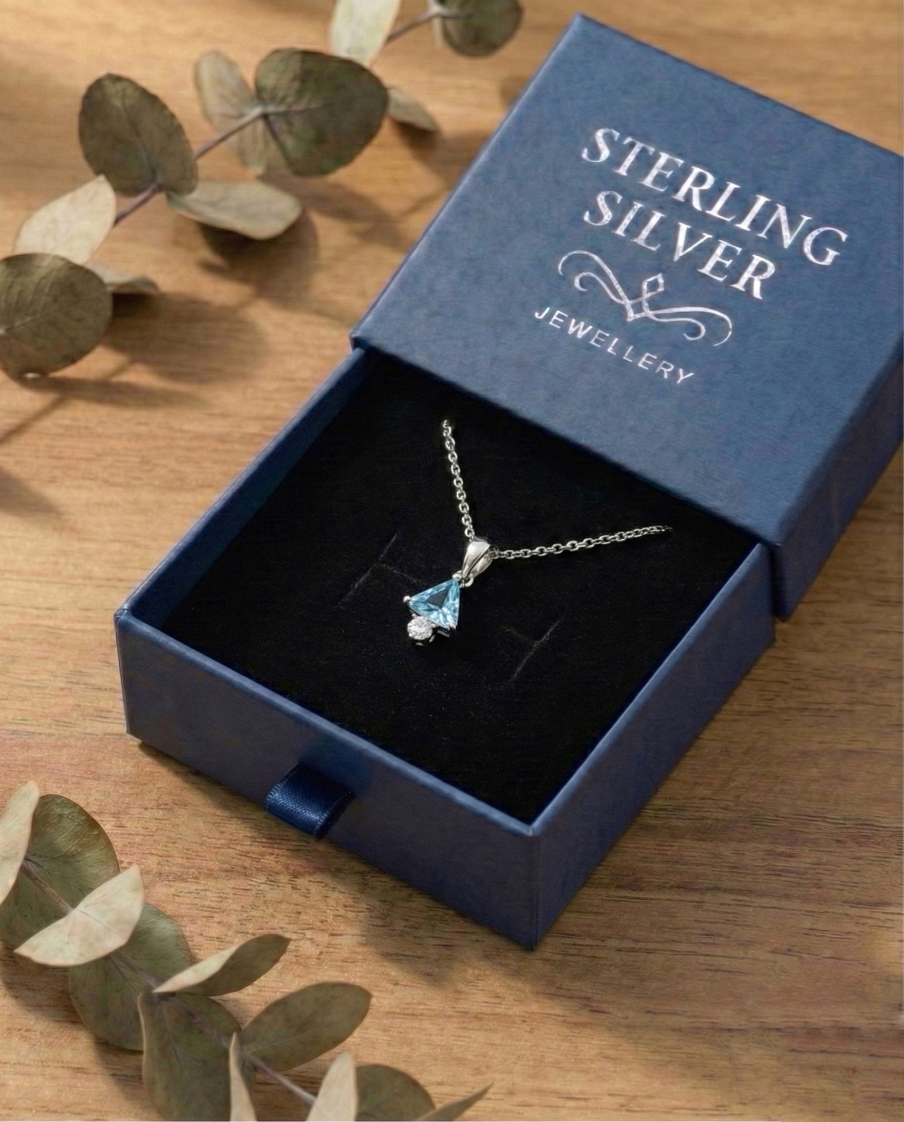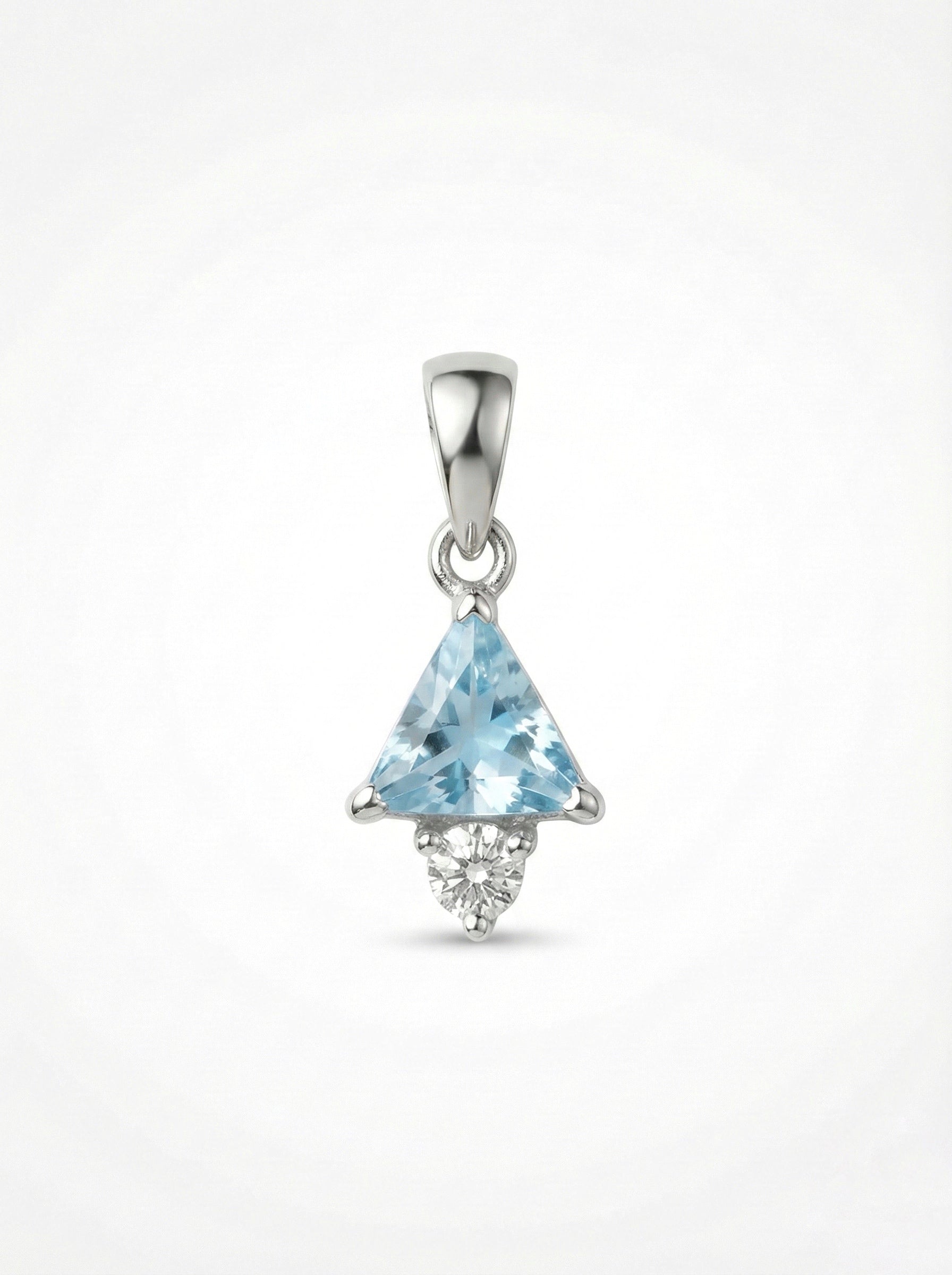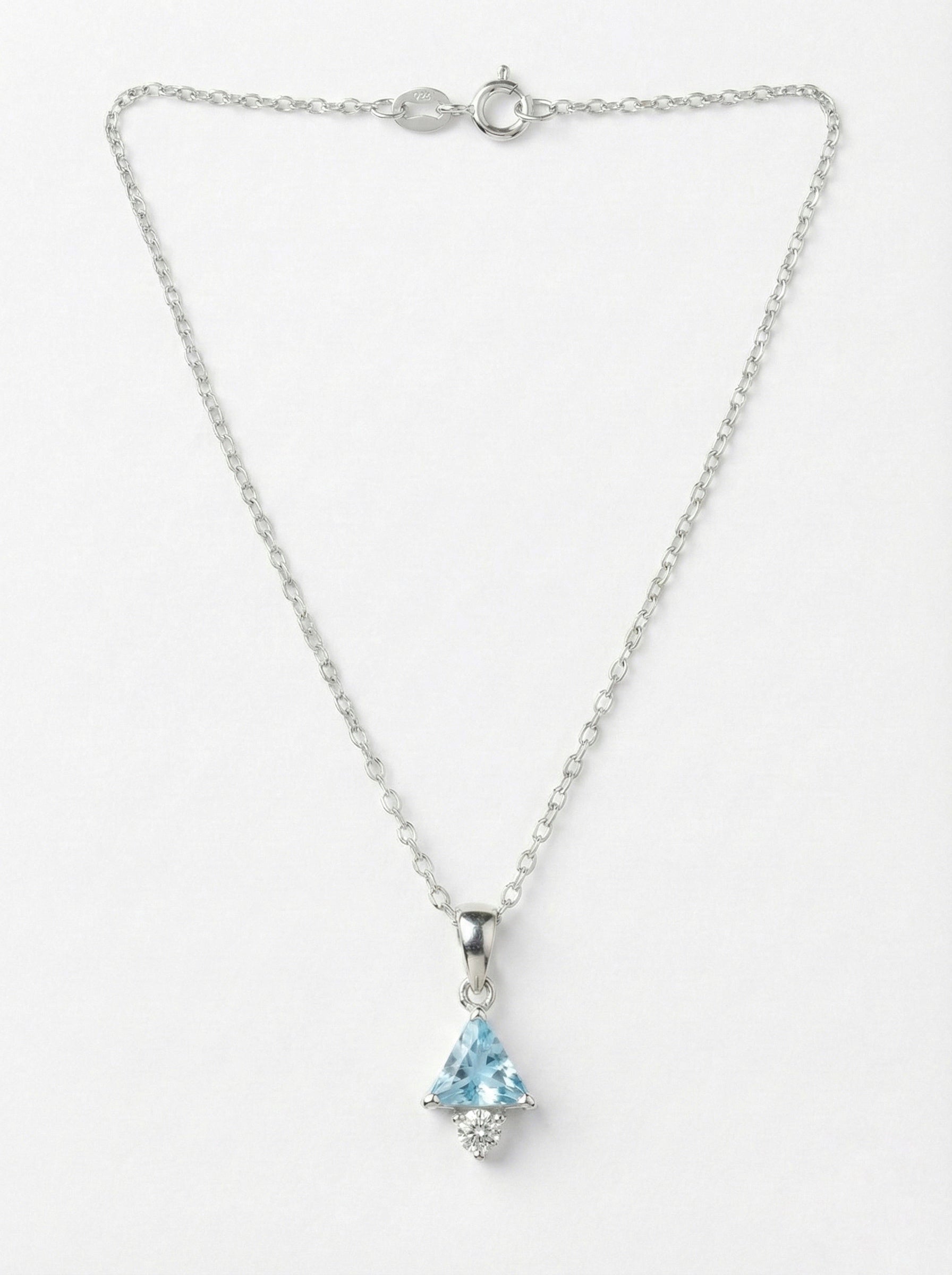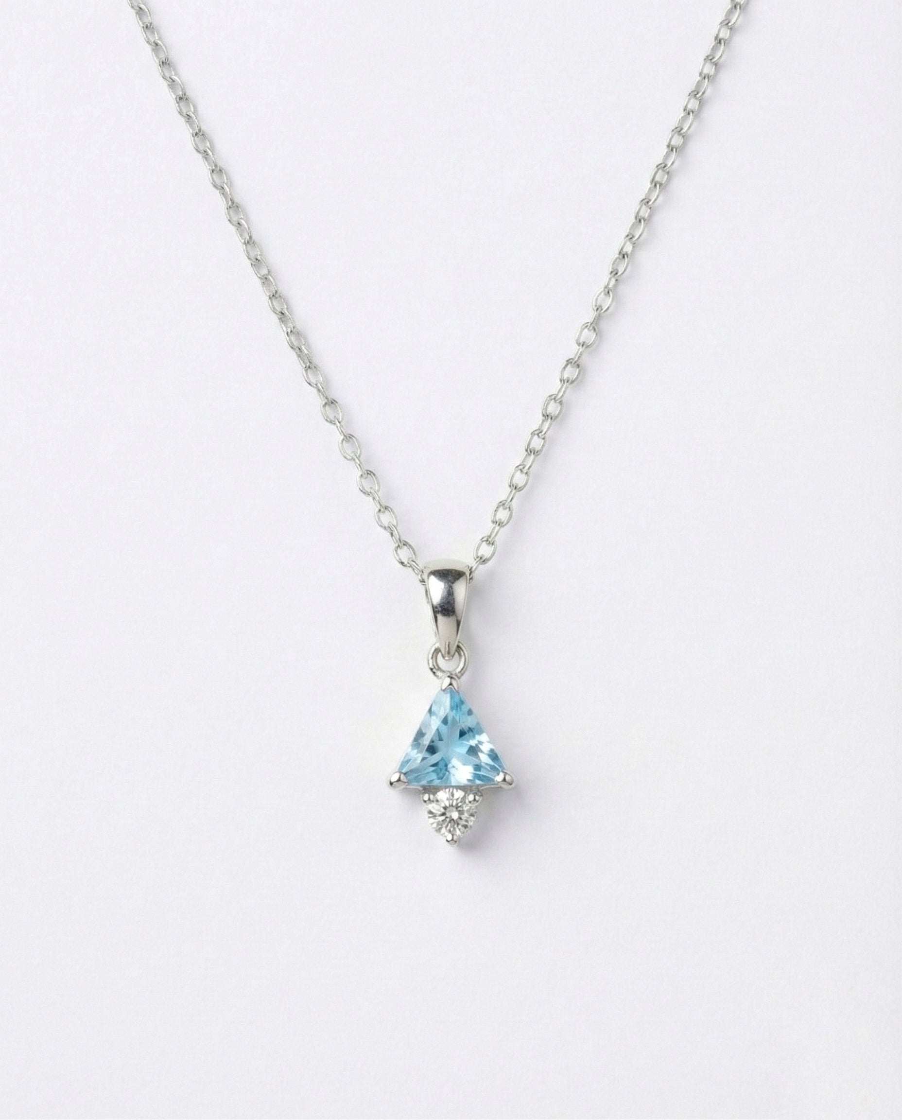 "Add a touch of modern geometry to your style with this chic Sterling Silver pendant. It features a unique trillion-cut Aquamarine-hued gemstone, pointing upwards and accented by a sparkling solitaire cubic zirconia at the base. The refreshing light blue tone paired with the sleek silver setting makes it a perfect, dainty accessory for daily wear."